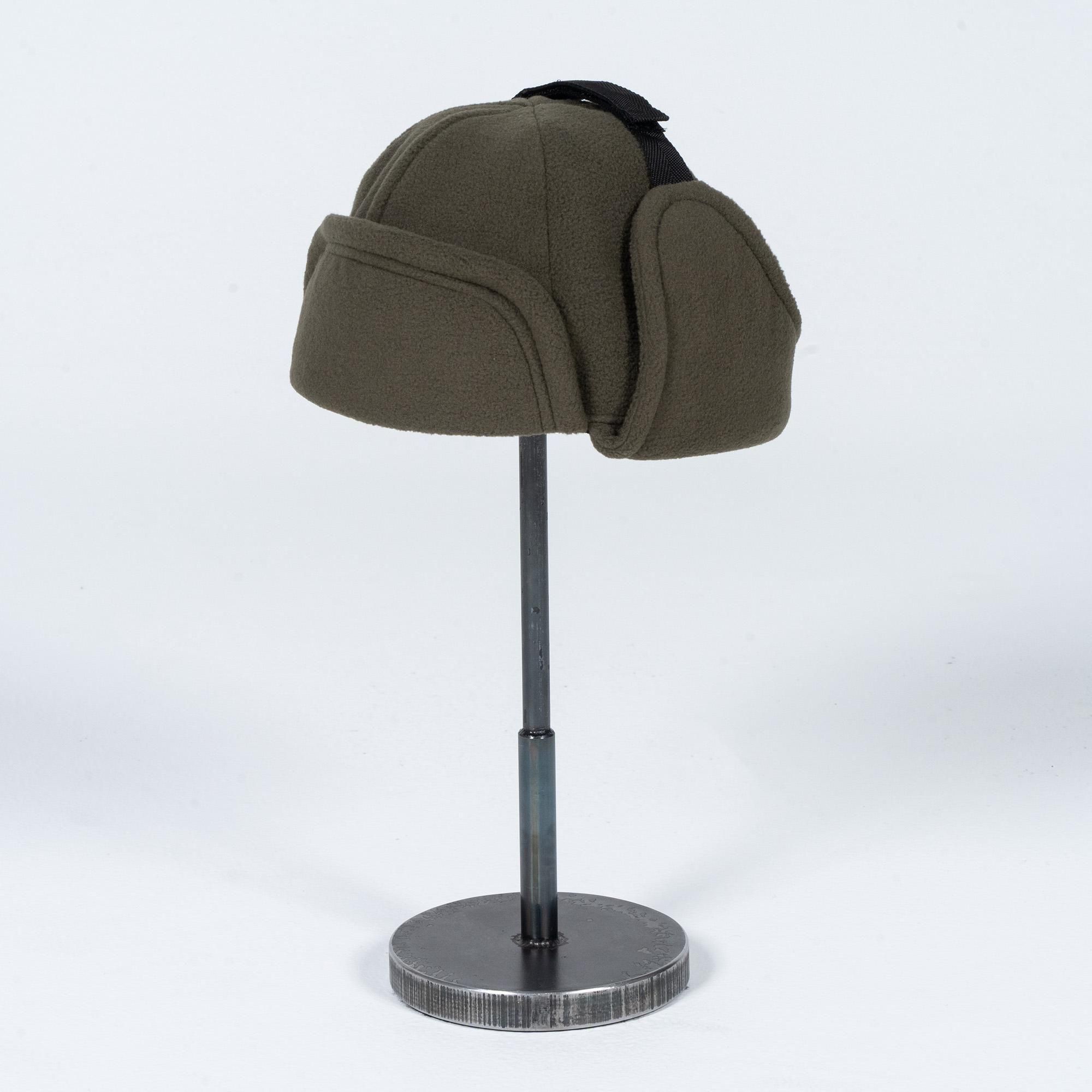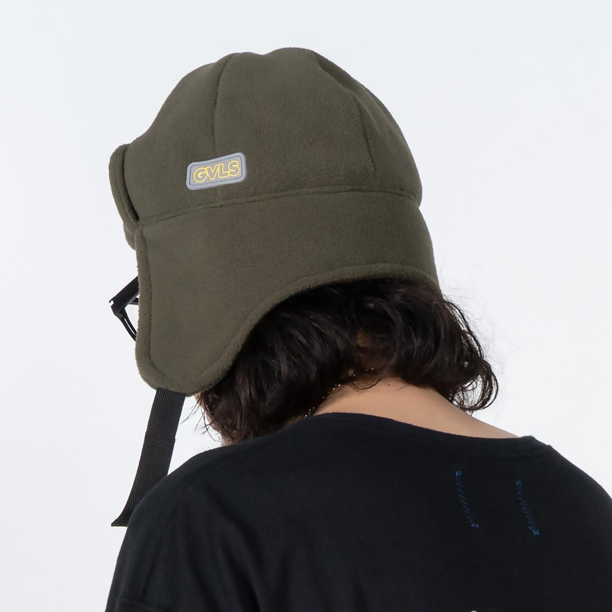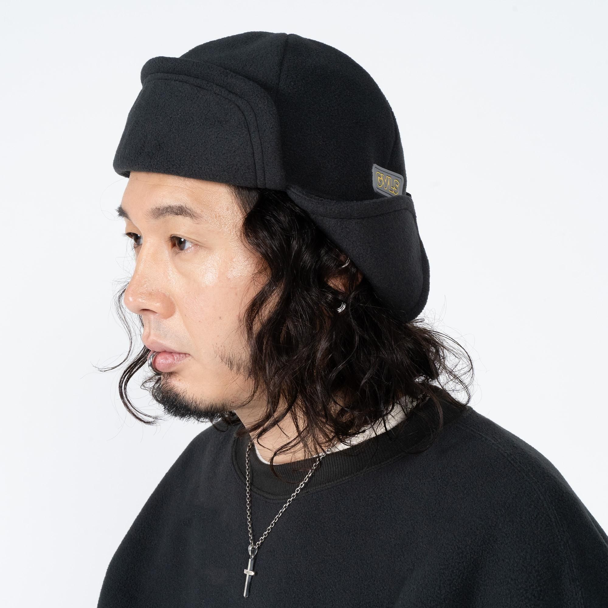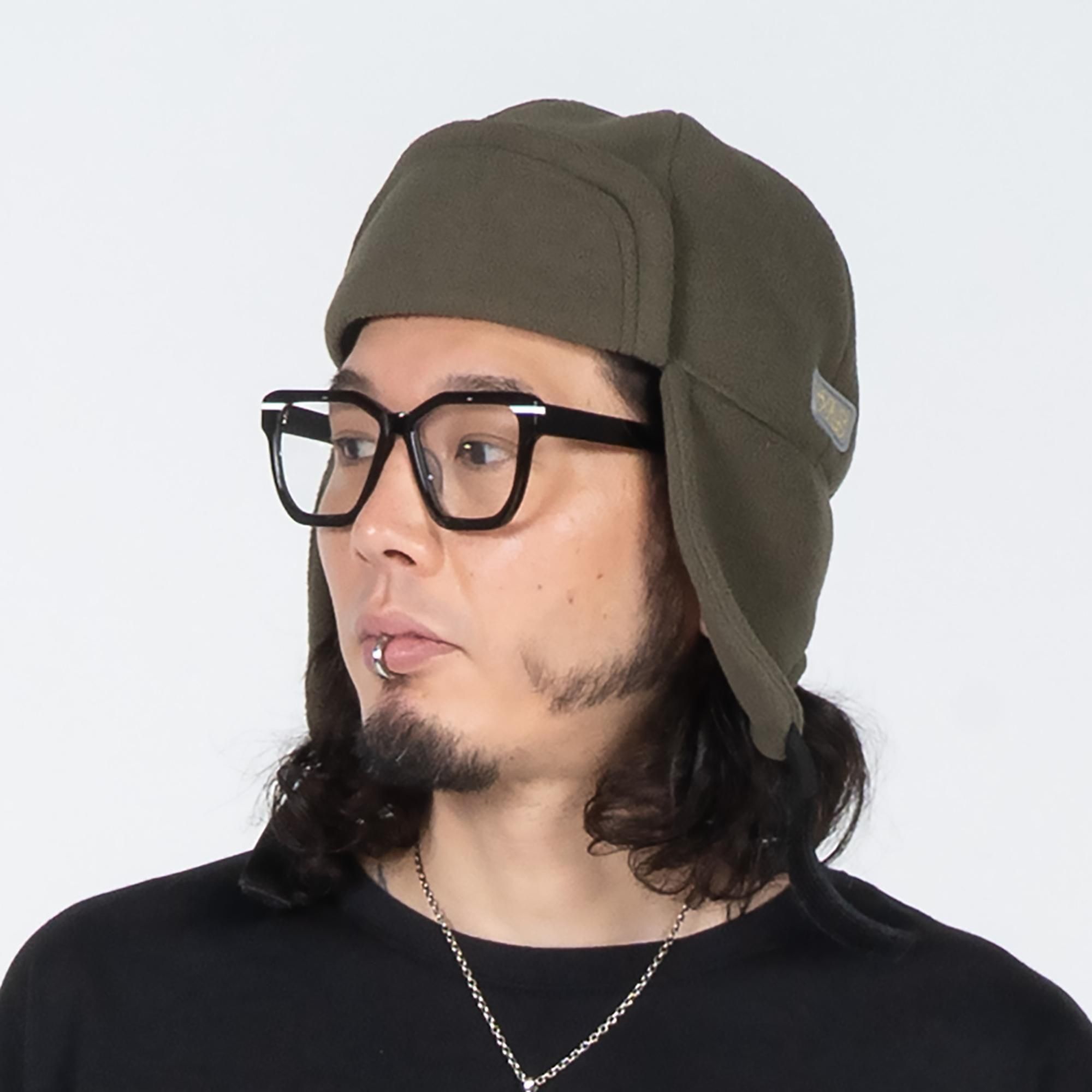 セットアップで登場したフリース上下と同素材のパイロットキャップ。イヤーフラップを含めたサイドは上げ下げできる仕様でフロントのツバは上げた状態での固定となっている。
