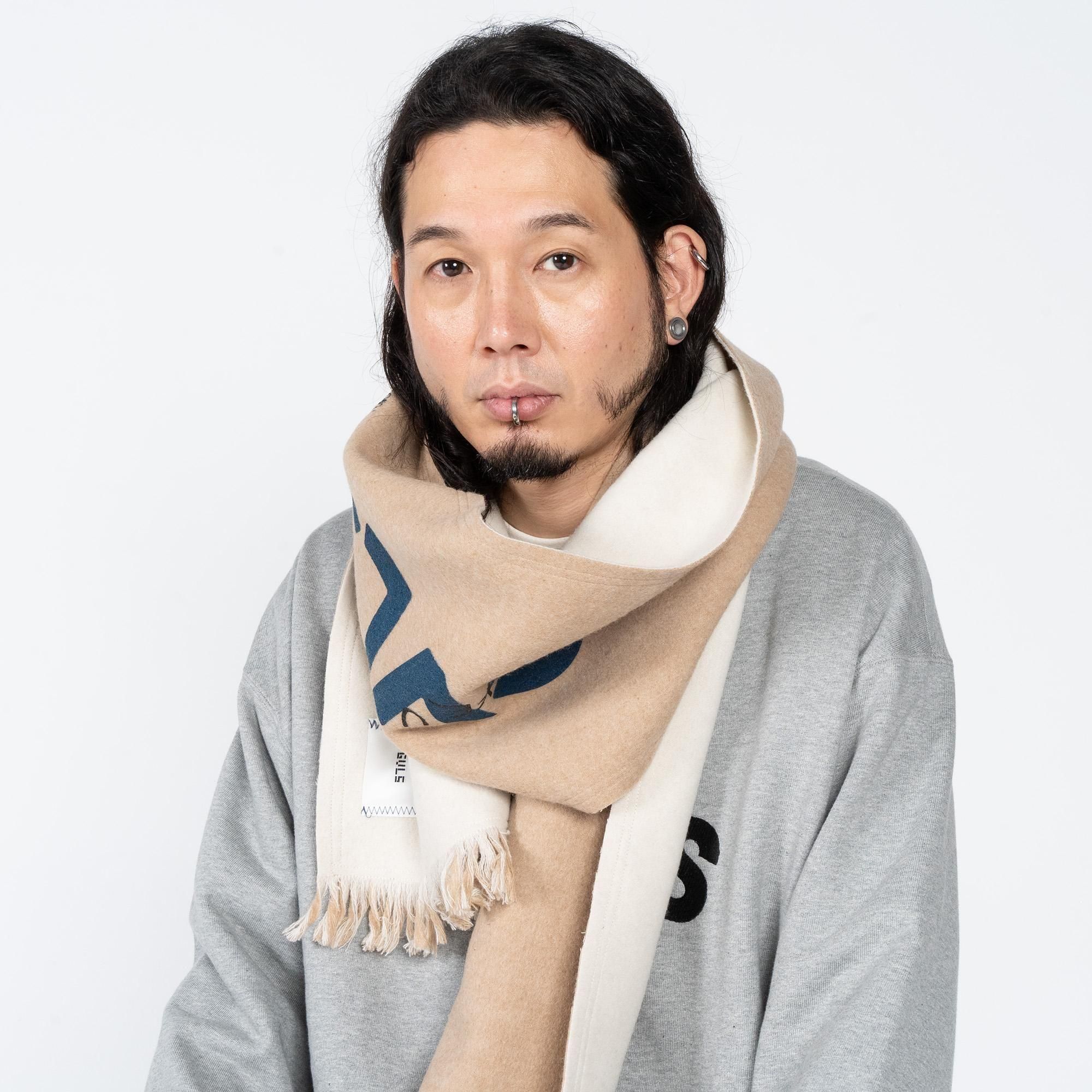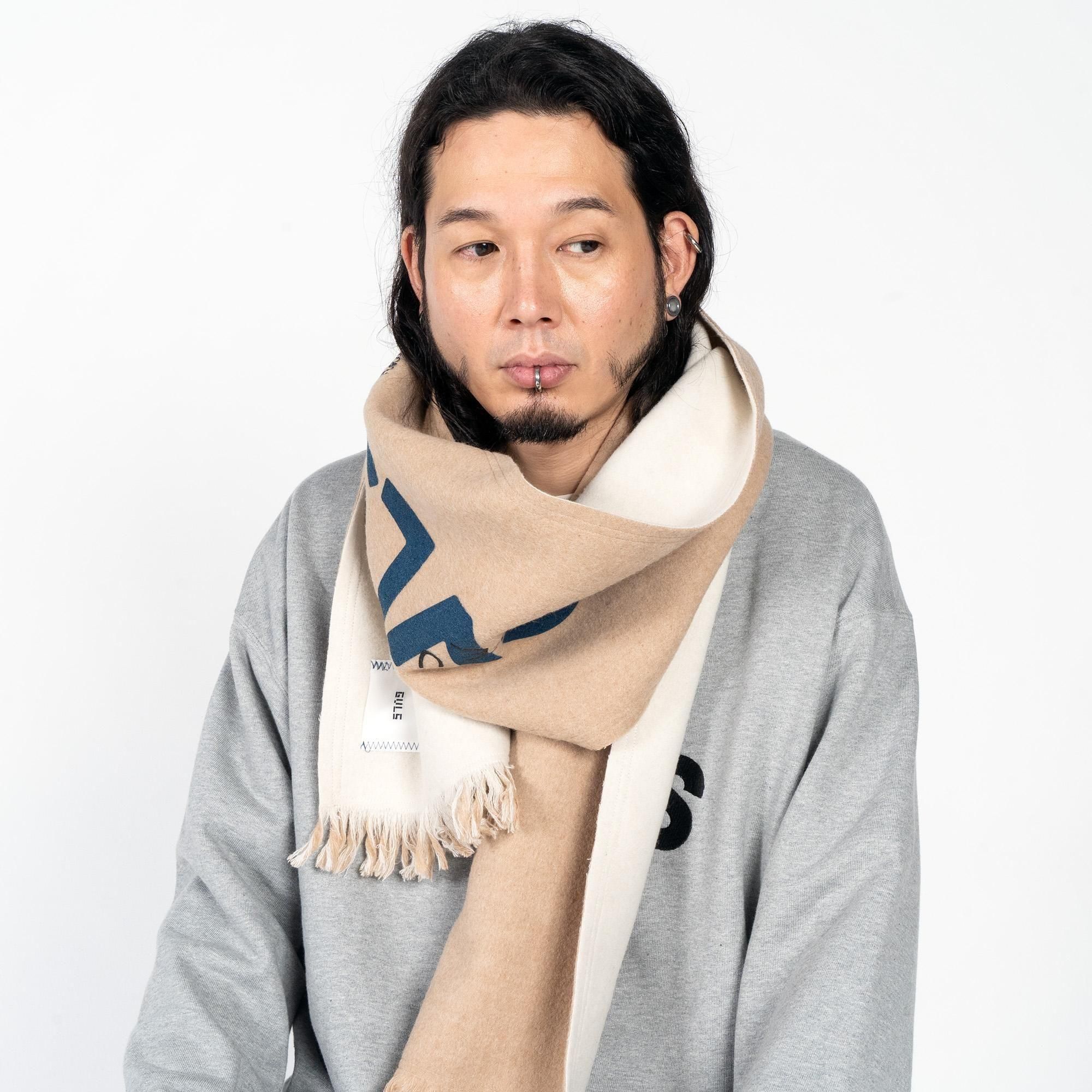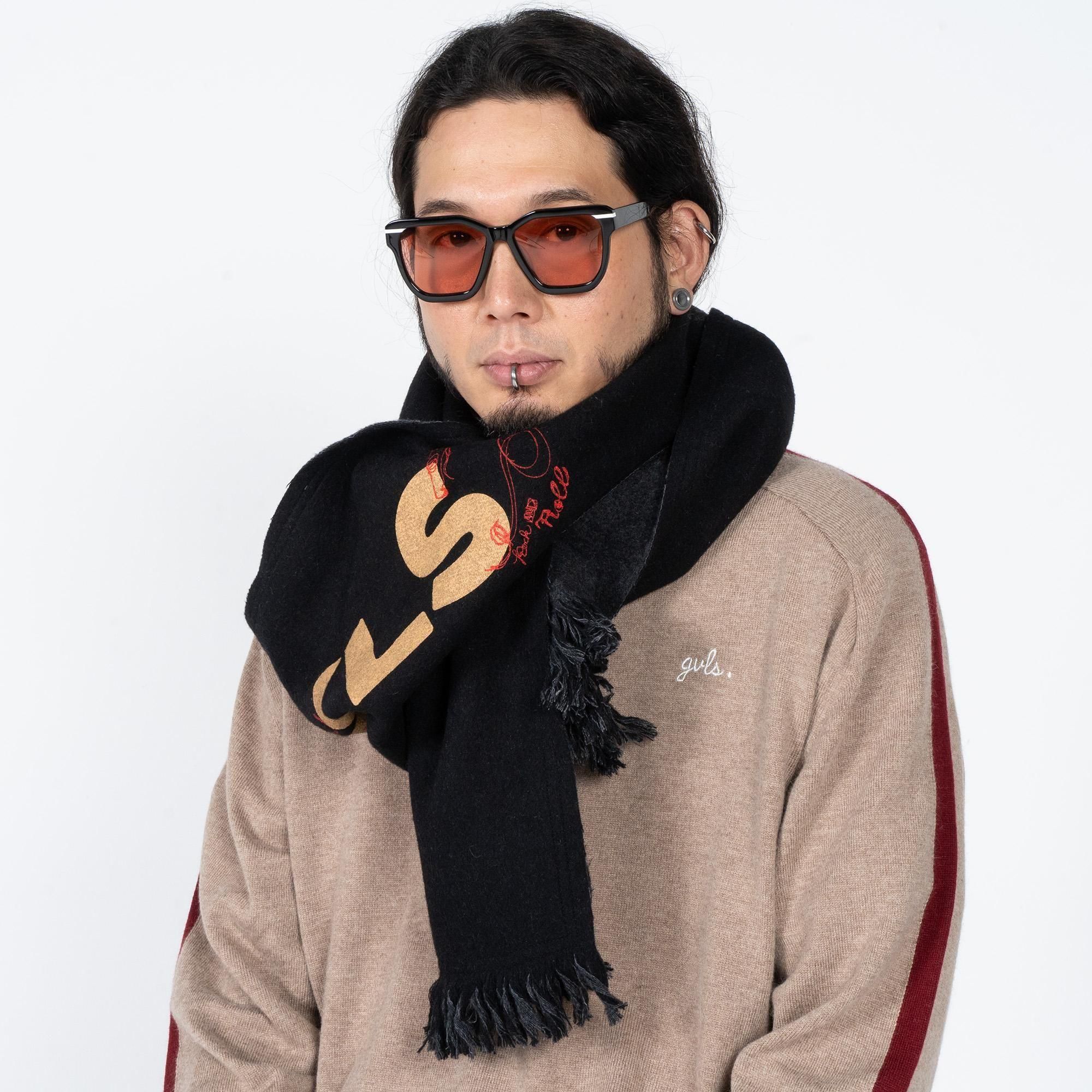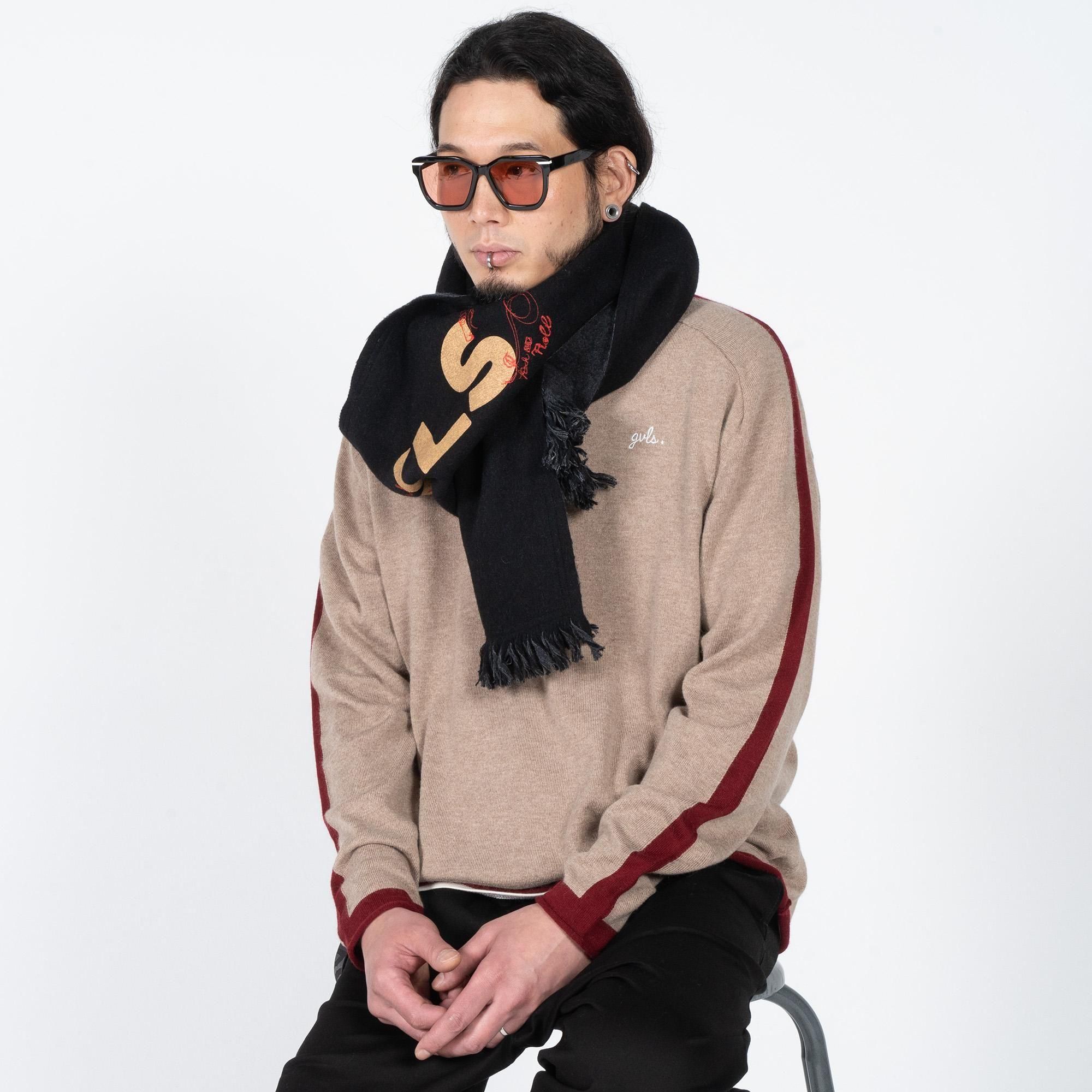 GVLS定番のロングマフラー。両面色違いの無地のボンディング加工になっており両端は短めのフリンジ仕様に。