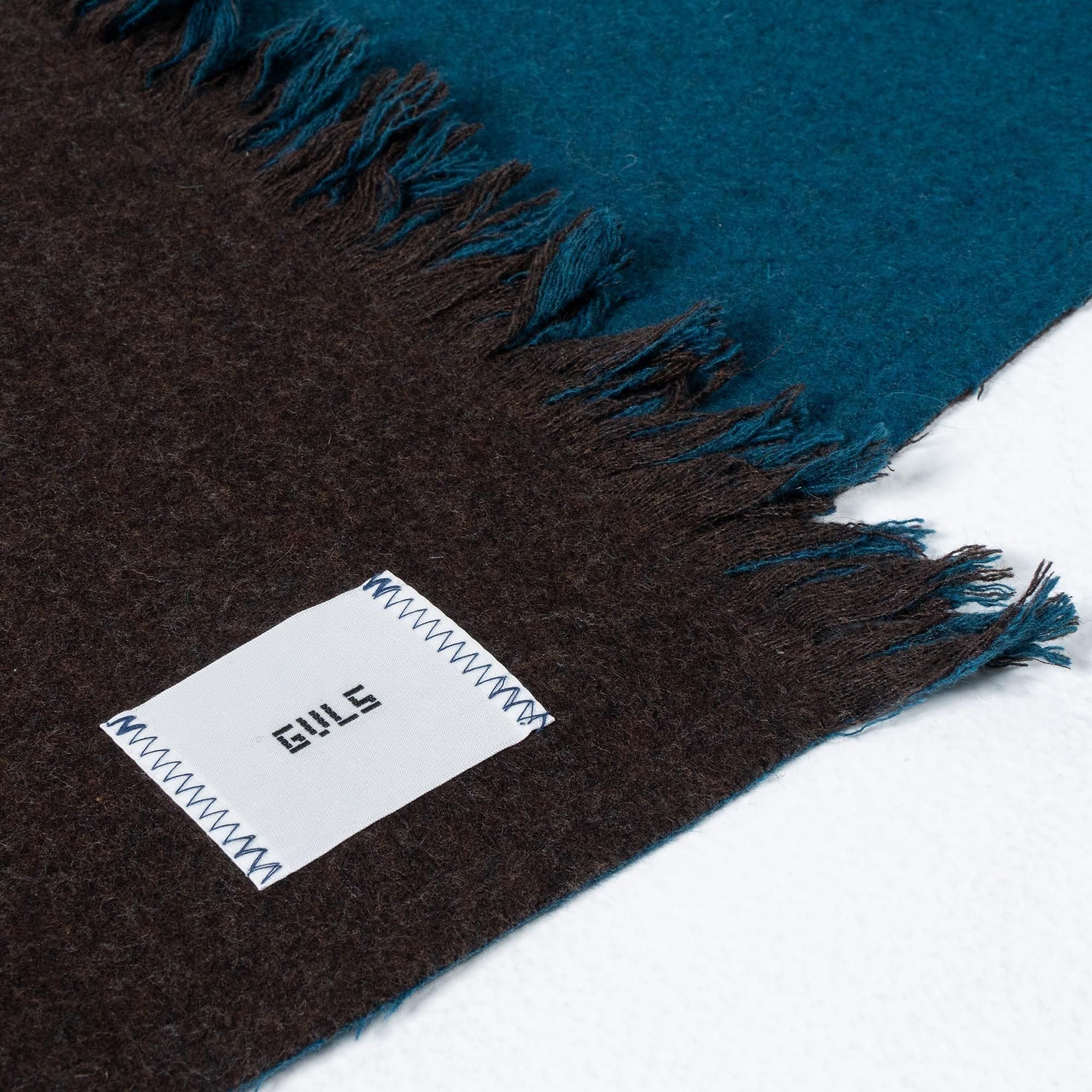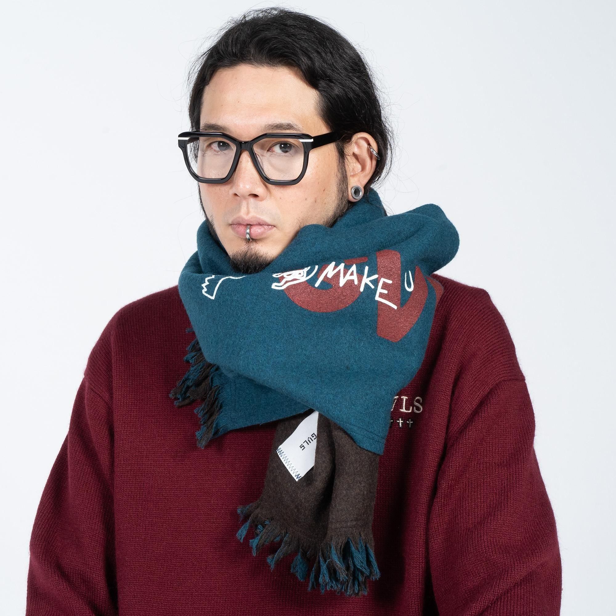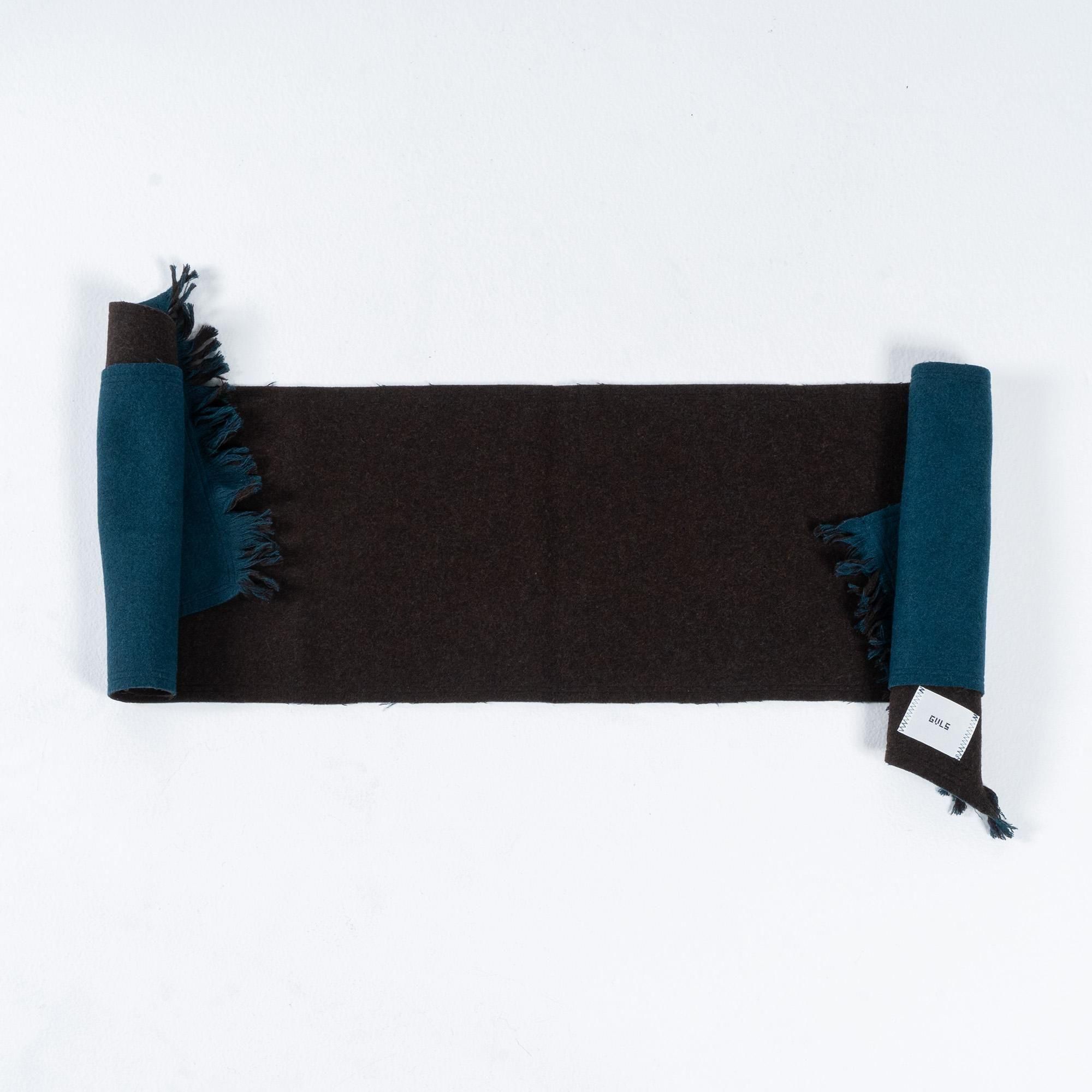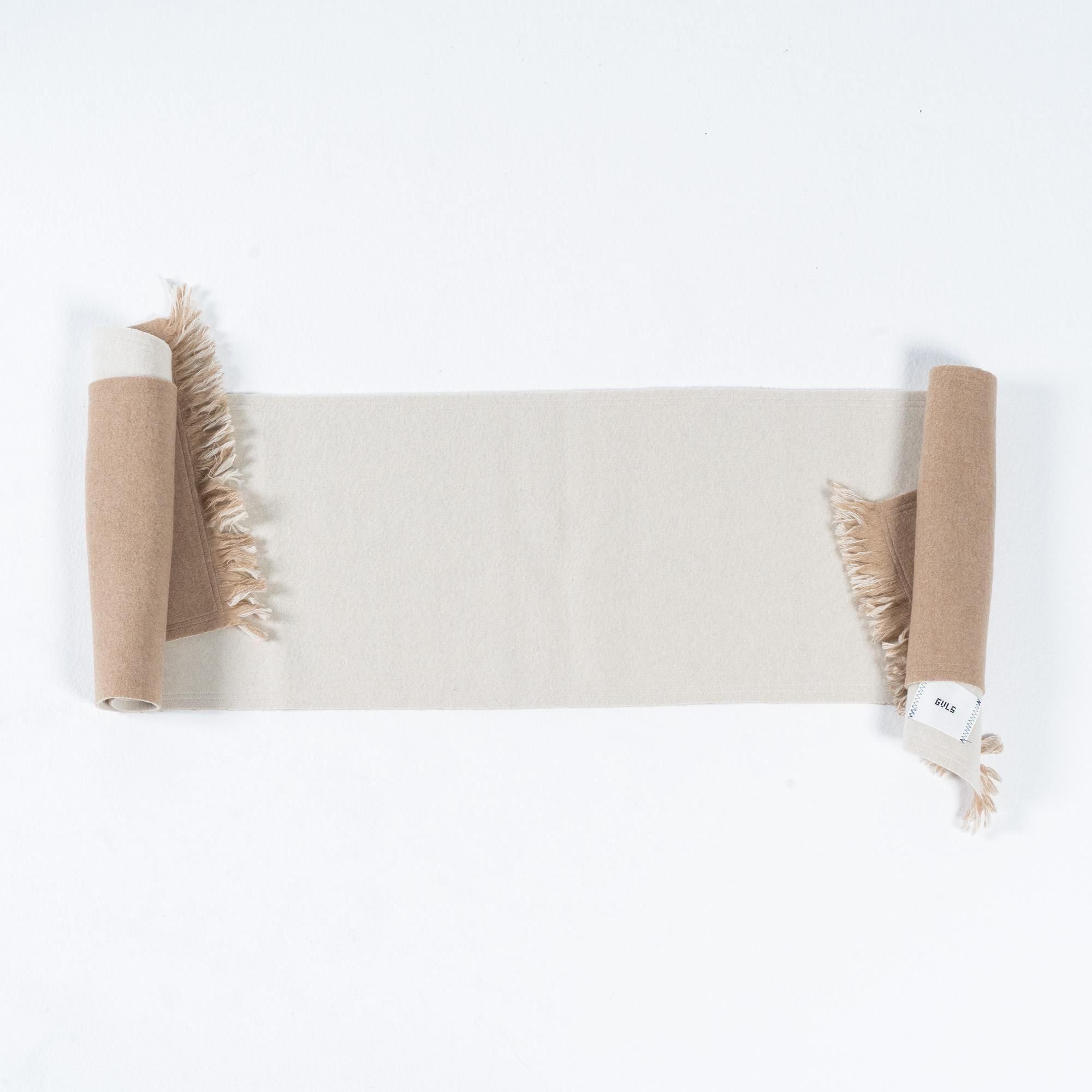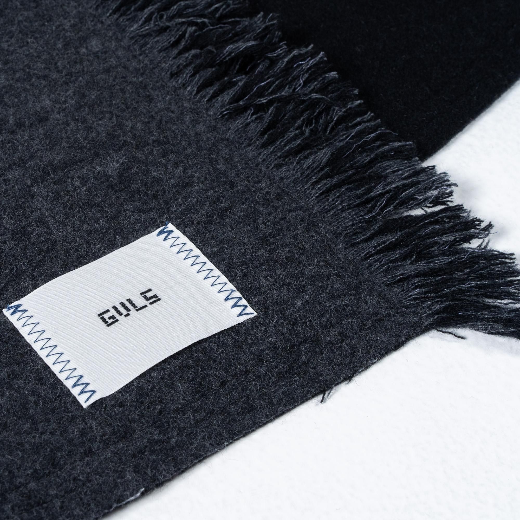 GVLS定番のロングマフラー。両面色違いの無地のボンディング加工になっており両端は短めのフリンジ仕様に。