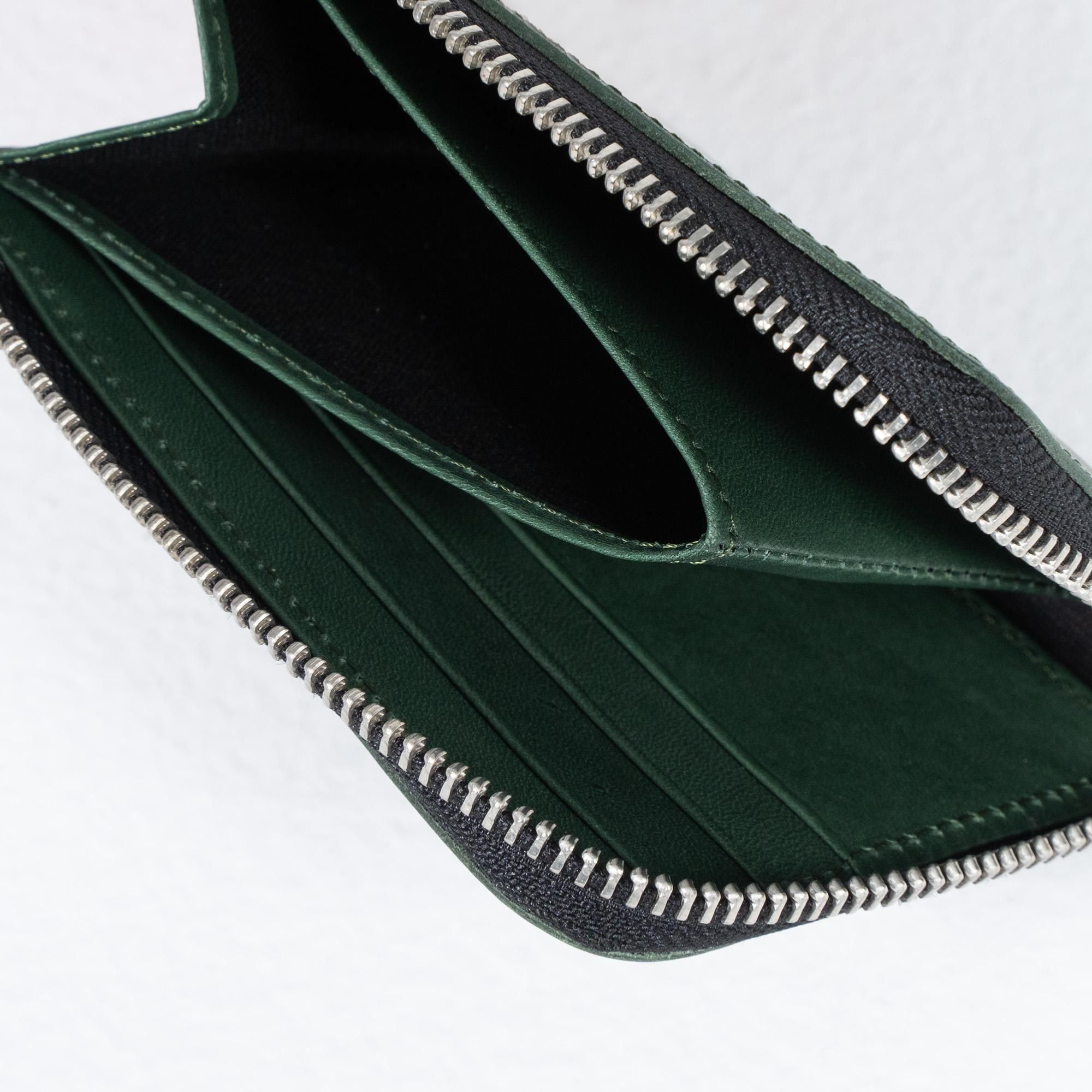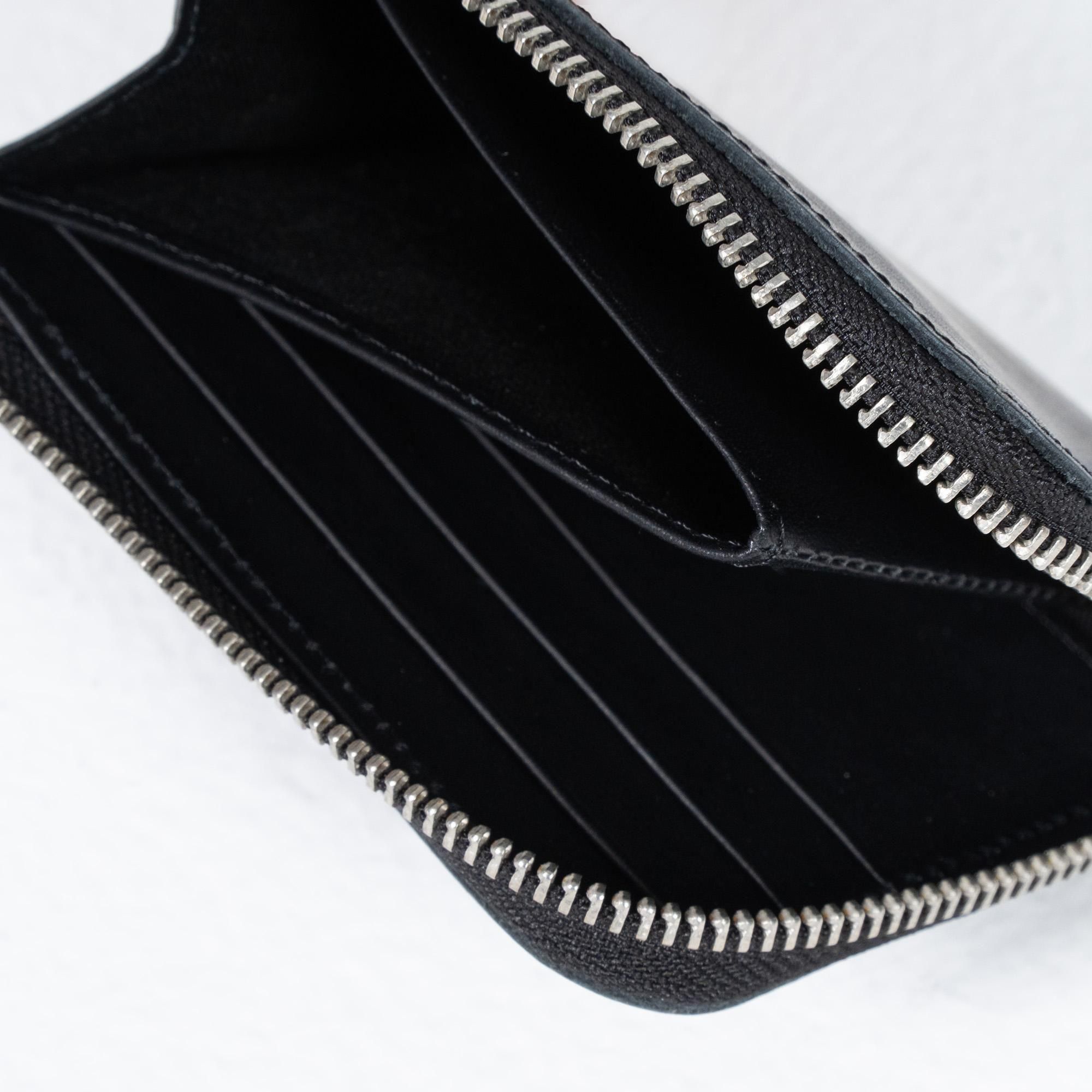 内側中央位置に配置された小銭入れはボタンやファスナーなどのないシンプルな袋状の作りになっており、紙幣は小銭袋を挟み込むようにも、折りたたんでしまうことも可能。